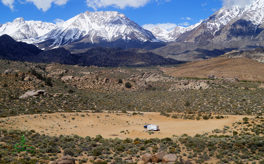 As you follow Highway 395 through Bishop, turn west onto CA-168/Line Street. After 7 miles, turn right onto Buttermilk Road. Keep your eyes out for dispersed camp spots all along this dirt road. This area is well known and a highly trafficked rock climbing destination so the closer you are to the rocks, the less privacy you will likely have. There are a lot of tent/car camping sites and fewer sites for large rigs. And since this is a popular area it may fill up on weekends so if you have a rig, it is suggested to scout ahead.