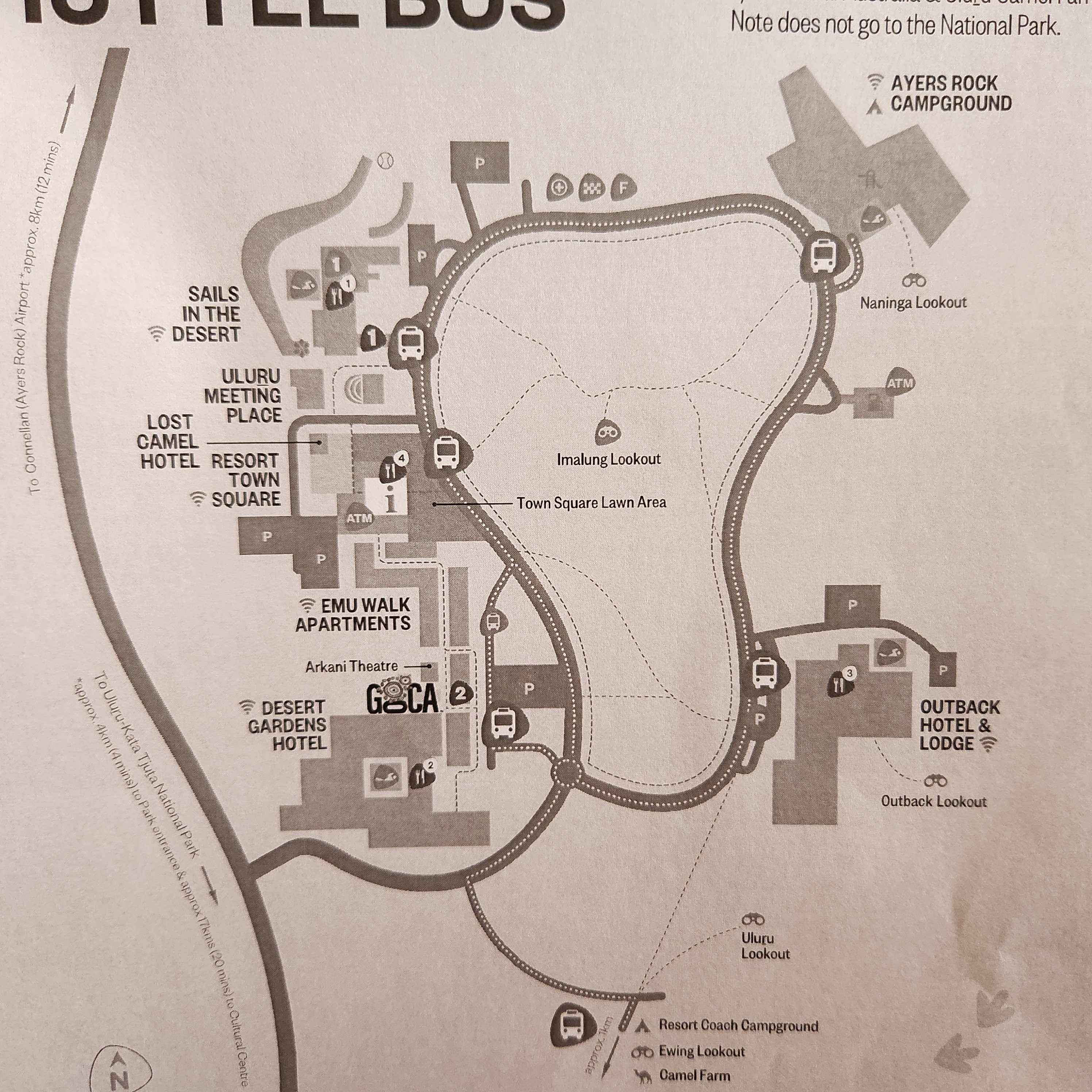 Yulara is where you will stay for any exploration of Uluru or Kata Tjuta or any place else in the national park. It is a small community of hotels and a small town center. There is a free shuttle that drives the loop on the hour. This area also has very strict rules regarding purchasing alcohol. There are only a couple places and when you do buy it you have to show your hotel key card.