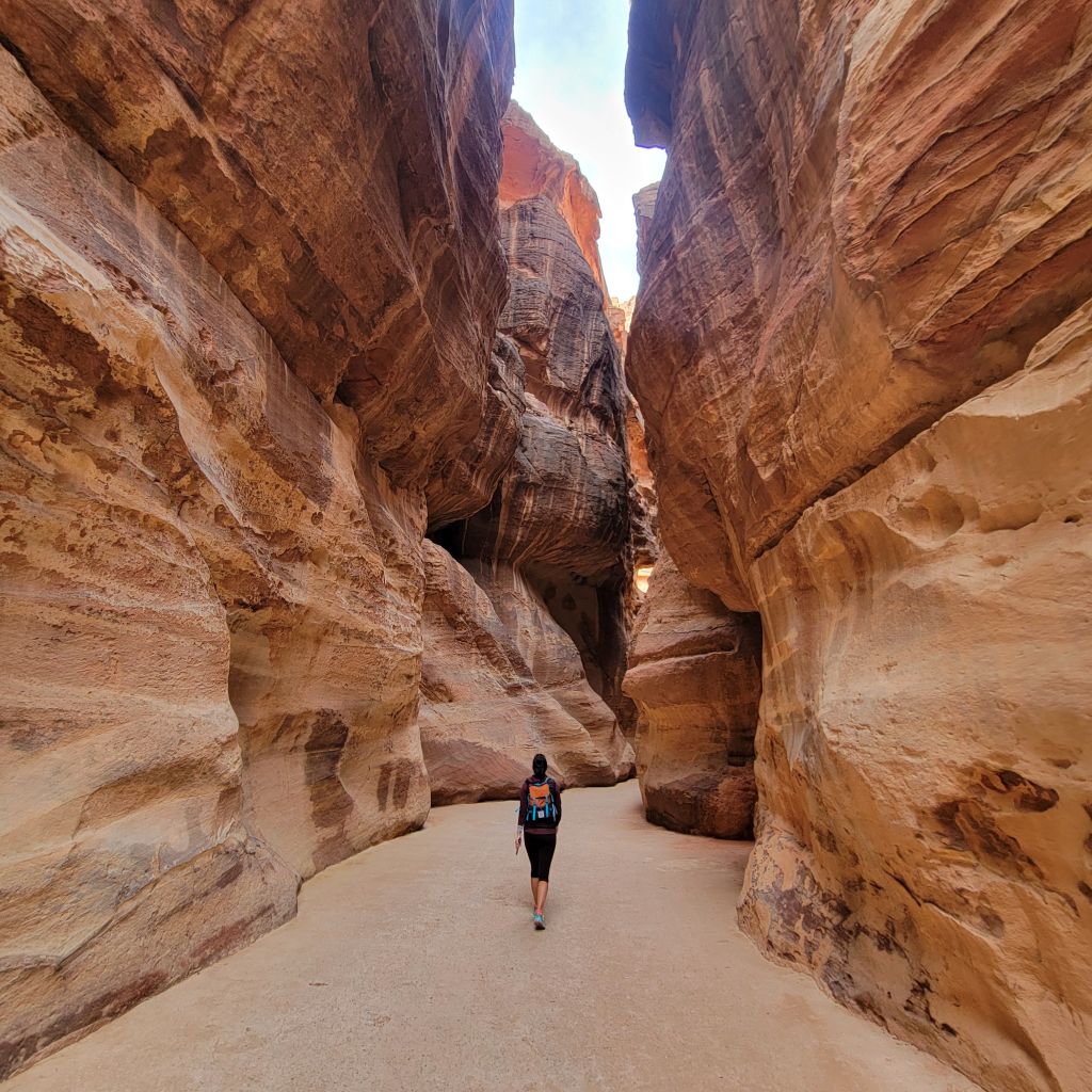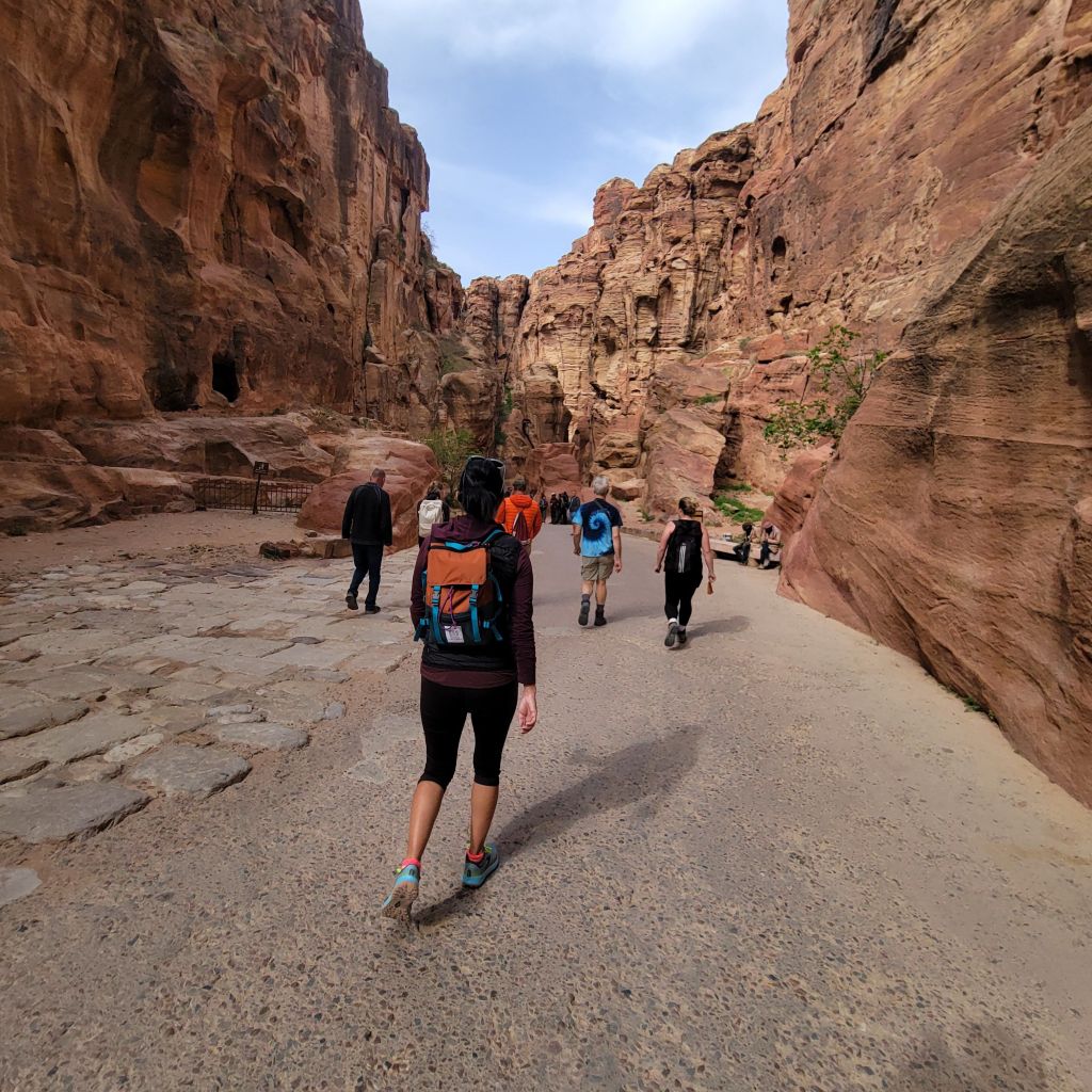 That first 1.5 miles is so much fun with seeing your first rock cut temple, Djinn Blocks and then making your way to The Siq. The Siq is a narrow gorge (slot canyon). There used to be an arch as you entered, but time has taken that away. What you do get is the beautiful towering rock walls, water channels that were used thousands of years ago and multiple carvings. The rock walls will lead you right to The Treasury!