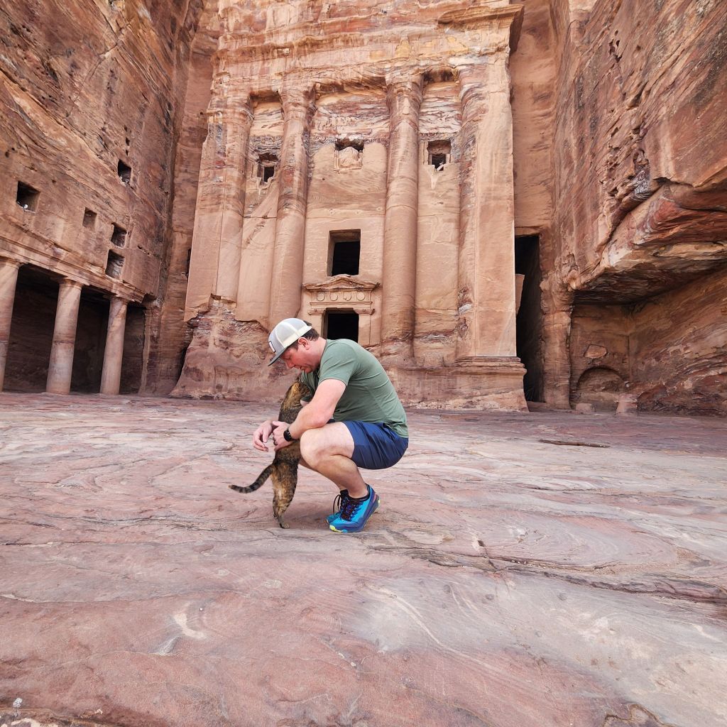 After the treasury it is all hiking, climbing and foot work from there. The first attraction we went to was The Royal Tombs. Four beautiful rock cut royal tombs line the wall. What we didn’t expect were the cats at each location. They seemed to have their spots and when you thought it was going to be hard to leave because they would follow, they didn’t cross a certain line. This was a good thing because Kevin fell in love with one of them!