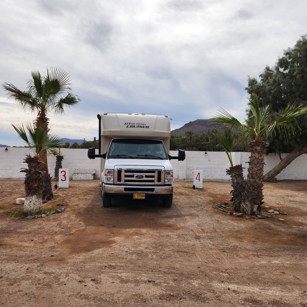 San Ignacio is a cute little town that you have to go through when driving south. When the highway takes you inland it is desert all around you and then you take a little detour off the highway and end up here, in a little oasis with palm trees, GRASS (!) and the cutest little town. From the campground it is about a 5 minute walk to the town square. There isn’t shopping, but there are about a half dozen restaurants to check out. When we were there it was $35 USD/night. There was only 12 volt and you could get water but it wasn’t set up to be hooked up to it while you were camping. There was clean bathrooms and showers here though!