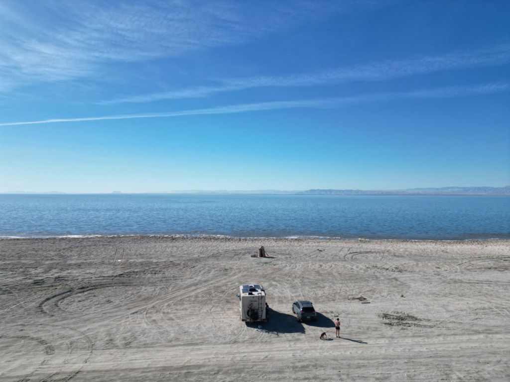 This was a really unique place to boondock. Quick history of this area. This lake was created in the early 1900s. It quickly became a vacation destination. Resorts and towns popped up along the water. However, by the 1980s the water had become toxic due to agriculture runoff. The fish life died, along with the bird life from the toxic water and dust. Any bird life that was able to stay alive, left. The resorts closed and towns almost became ghost towns. The story isn’t all sad. With renewed interest in the area, local and state funding have been put towards bringing back life to the area. The art community found a new area to make their own. It seems to be safe enough to camp for a bit but I would be careful with your pets. Our pup ended up with an allergic reaction on her skin from something there.