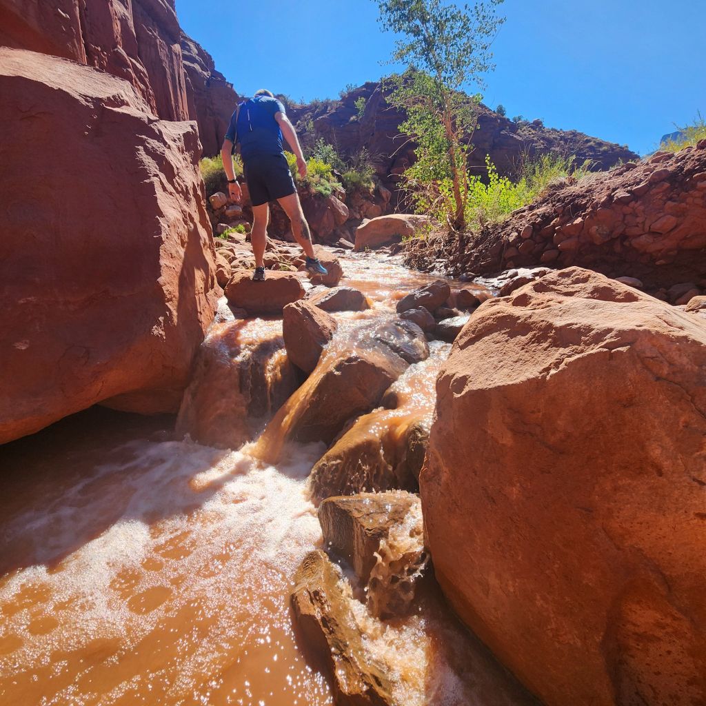 This hike is along a stream. We knew we would get wet and so we decided to see how long you could go before actually having to walk in the water. We got to about a mile and then it just became easier and a lot more fun. If you have never hiked through a canyon or within a stream, you have to know where to step as there are a ton of ankle breakers underneath. It isn’t clear water here. It is as brown as the rocks and walls. Step carefully.